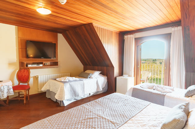 Acomodação para casal + 2 solteiros ou 4 solteiros. Opções de quartos no 2º e 3º andar do prédio principal da Pousada. Este quarto possui varanda com vista para a fachada da Pousada
